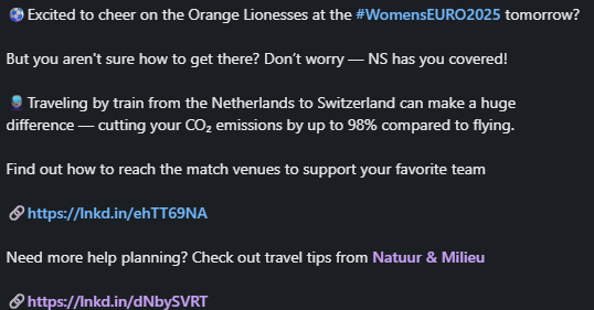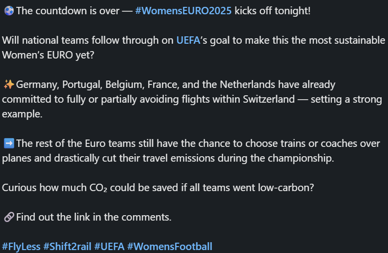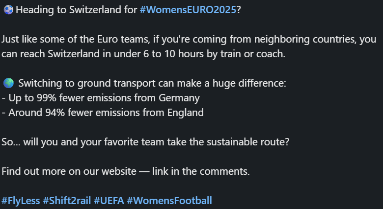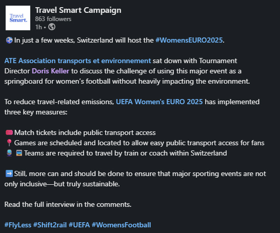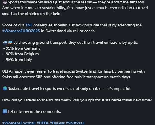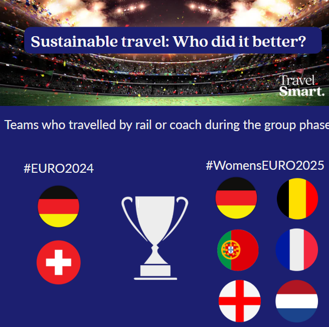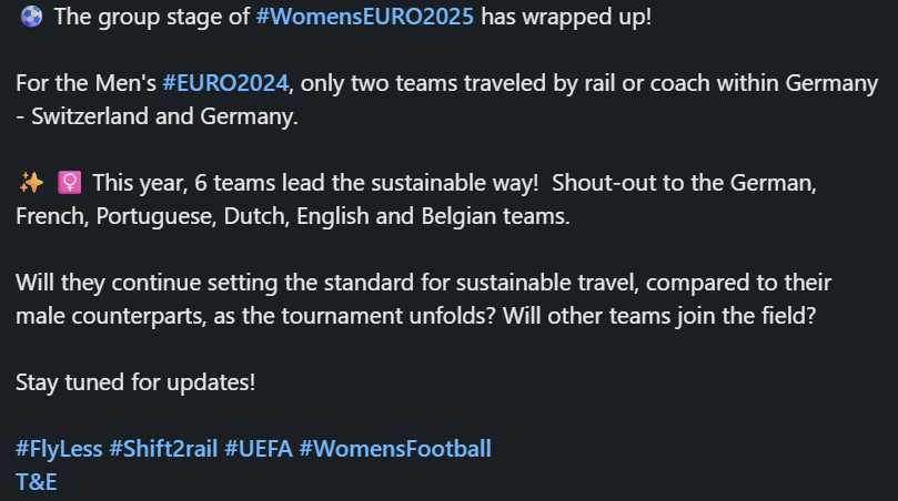 Die Travel Smart-Kampagne von T&E und einer Gruppe von Partnerorganisationen begrüßte die Fortschritte, die Frauen-Nationalmannschaften im Vorfeld der Fußball-Europameisterschaft 2025 gemacht haben, und forderte die UEFA auf, den Schwung dieses Jahres zu nutzen und noch weiter zu gehen, indem die Verpflichtung für die Mannschaften, mit dem Zug oder Bus in das und innerhalb des Gastlandes zu reisen, wenn die Reise eine bestimmte Entfernung oder Dauer nicht überschreitet.