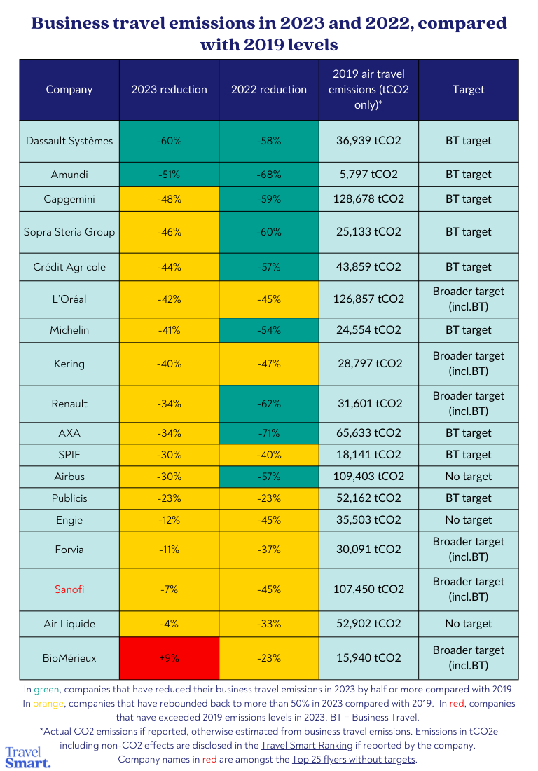 One company, bioMérieux, has exceeded its 2019 flight levels (+9%).  At the same time, it says that in 2023 it set an internal reduction target of -10% compared to 2022 travel emissions, a positive development that should help to correct its trajectory.