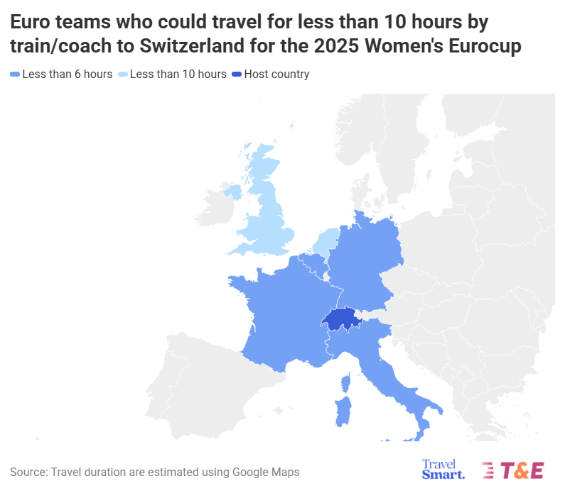 T&E’s Travel Smart campaign and a group of partner organisations welcomed the progress women’s national teams were making ahead of the Eurocup 2025, while calling upon UEFA to seize this year’s momentum and go further by requiring teams to travel by train or coach to and within the host country when trips are below a certain distance or duration.